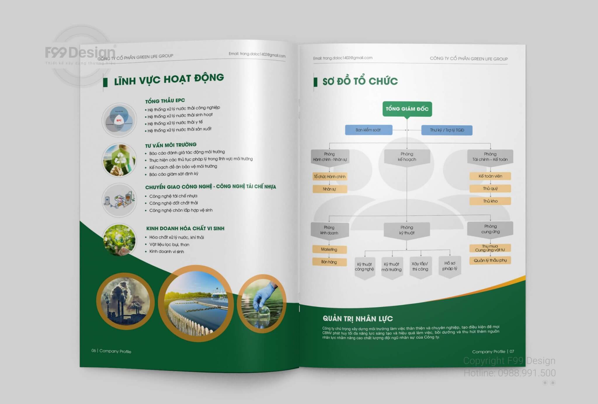 Hãy lấy ví dụ từ dự án thiết kế hồ sơ công ty mà F99 Design đã thiết kế cho Công Ty Green Life Group. Công ty với lĩnh vực hoạt động chính là: Tổng thầu EPC, Tư vấn môi trường, Chuyển giao công nghệ – Công nghệ tái chế nhựa,… Hồ sơ năng lực được thiết kế đơn giản, rõ ràng, màu sắc bố cục hài hòa. Nhờ vậy, khách hàng, chủ đầu tư trong tương lai dễ dàng nắm bắt sản phẩm, dịch vụ công ty đang cung cấp, mở rộng mối quan hệ hợp tác.